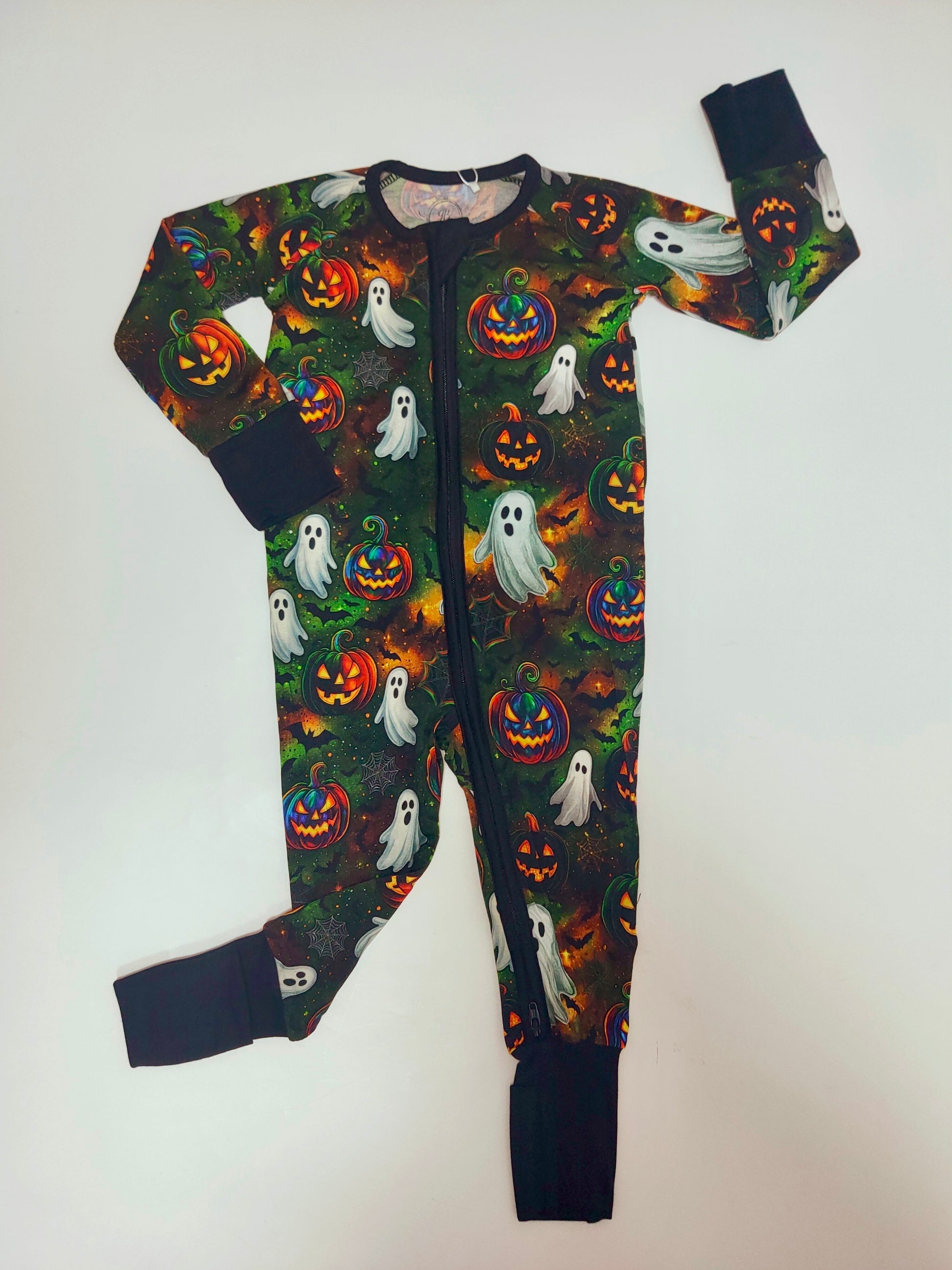 Our Halloween Zippy is made from buttery-soft, breathable bamboo fabric that keeps your child cozy and comfortable all day (or night). The playful design features glowing jack-o’-lanterns, floating ghosts, and a touch of Halloween magic—perfect for festive nights and cute seasonal photos.