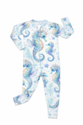 Our Seahorse Zippy is made from buttery-soft, breathable bamboo fabric that keeps your child cozy and comfortable all day and night. Featuring a dreamy seahorse design with soft ocean hues, bubbles, and delicate details, this piece is perfect for snuggles, sleep, and seaside dreams.